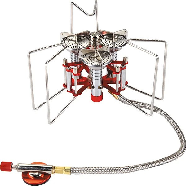 Узел крепления баллона отделен от горелки 40сантиметровым топливопроводным шлангом, что в свою очередь повышает ее устойчивость, а кроме того баллон при необходимости можно подогревать (очень осторожно), не прерывая процесса приготовления пищи.